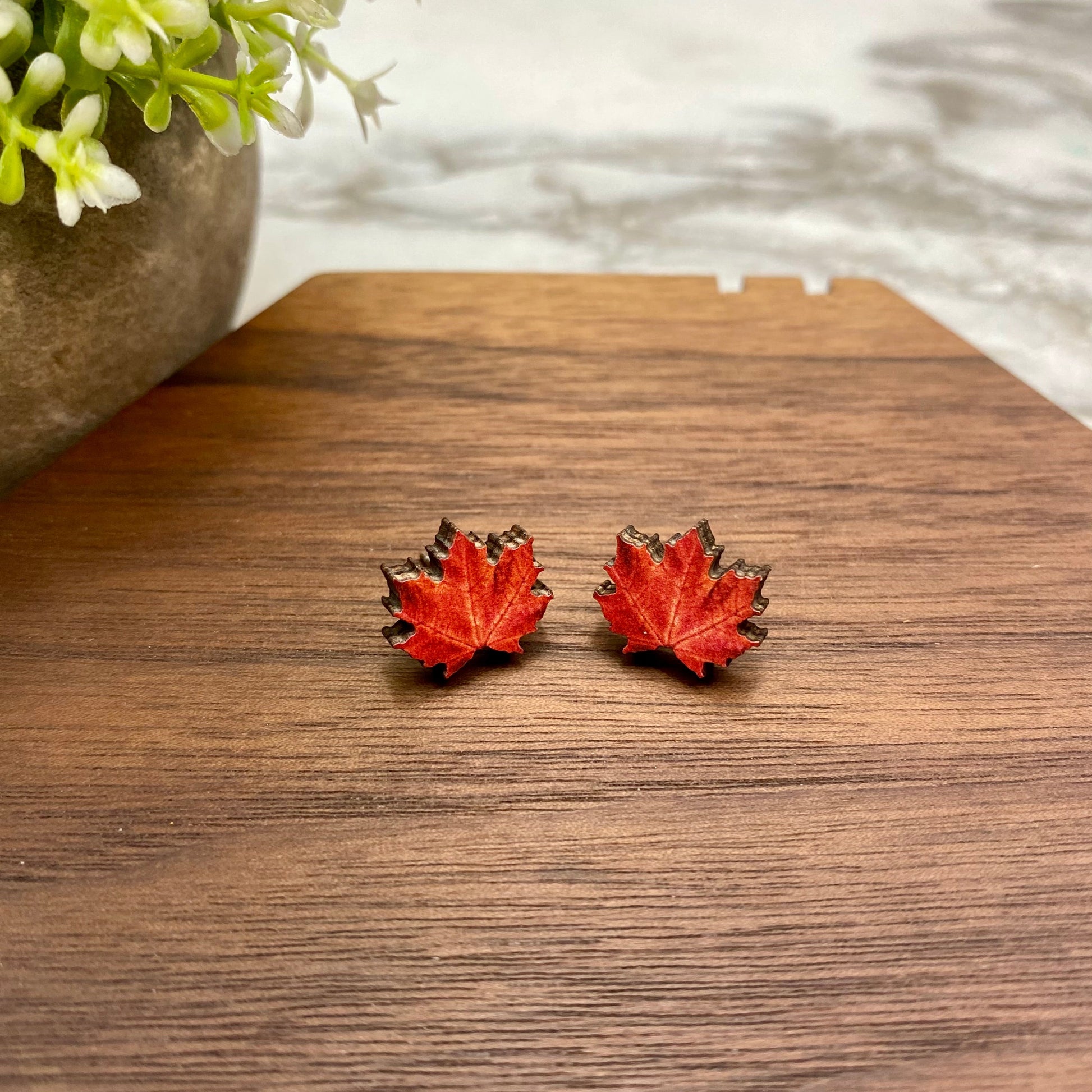 Wooden Stud Earrings - Fall - Red Leaf